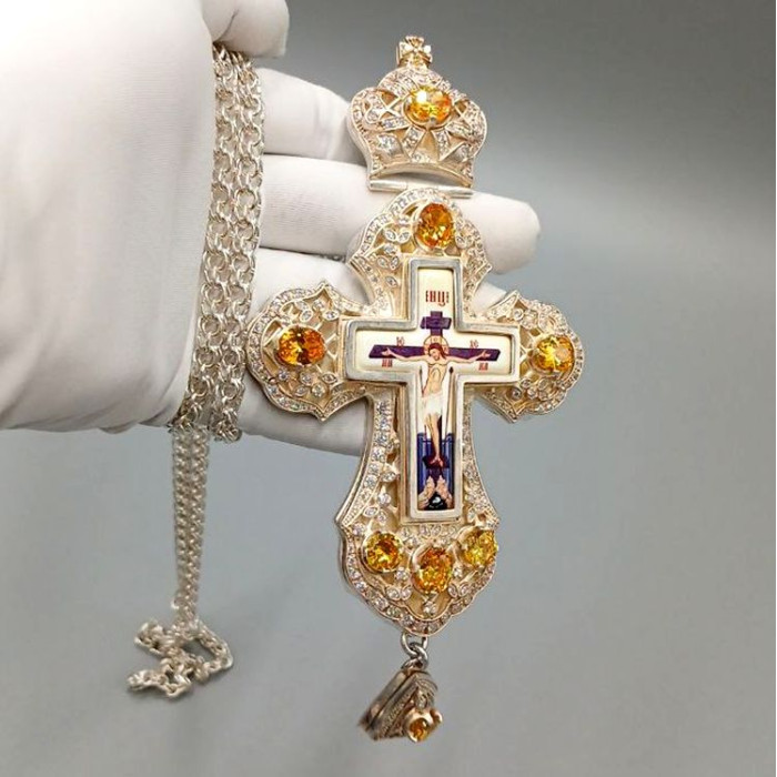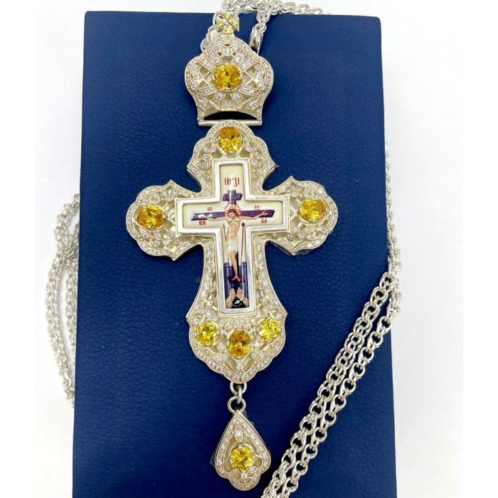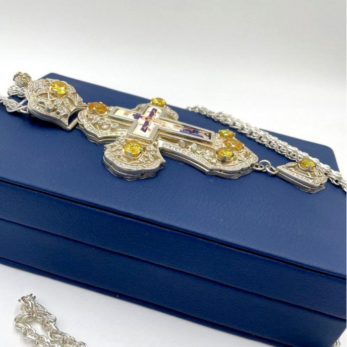 Православний наперсний хрест для священика з латуні в срібленні з принтом і ланцюгом, прикрашений вставками фіанітів.