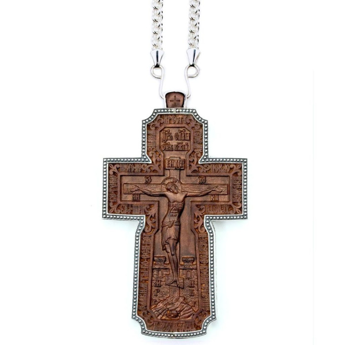 Хрест для священика з латуні в срібленні з декоративним чорнінням, з дерев'яним різьбленим образом, в комплекті з ланцюгом.