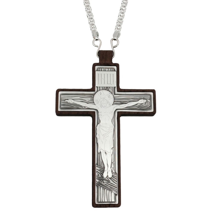 Хрест священика дерев'яний з вставкою з латуні в срібленні з чорненням і ланцюгом.