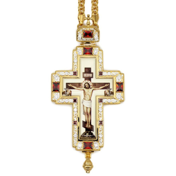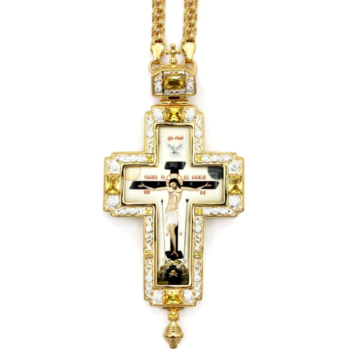 Хрест наперсний для священика з латуні в позолоті з фрагментарним срібленням і ланцюгом, прикрашений фіанітами