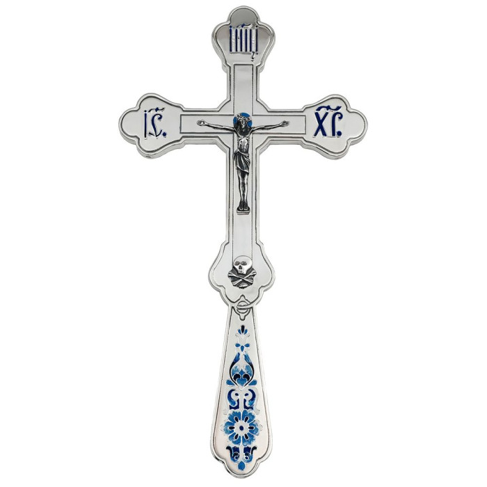 Хрест напрестольний з латуні в срібленні, прикрашений декоративним чорнінням і ювелірною емаллю.