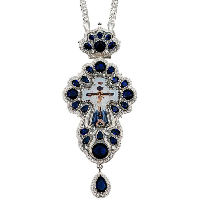 Хрест священика з латуні в срібленні, прикрашений фіанітами і декоративним чорнінням, в комплекті з посрібленим ланцюгом.