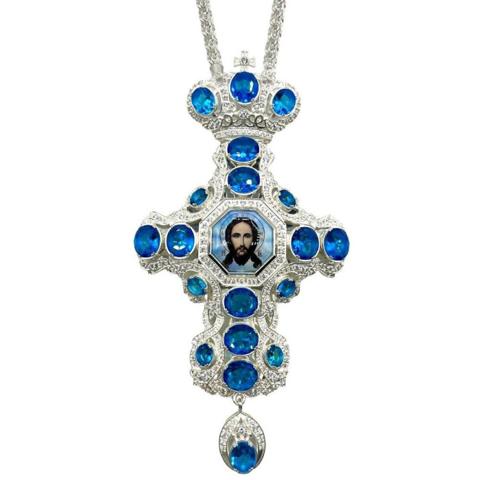 Хрест священнослужителя з латуні в срібленні, прикрашений фіанітами, укомплектований посрібненим ланцюгом.