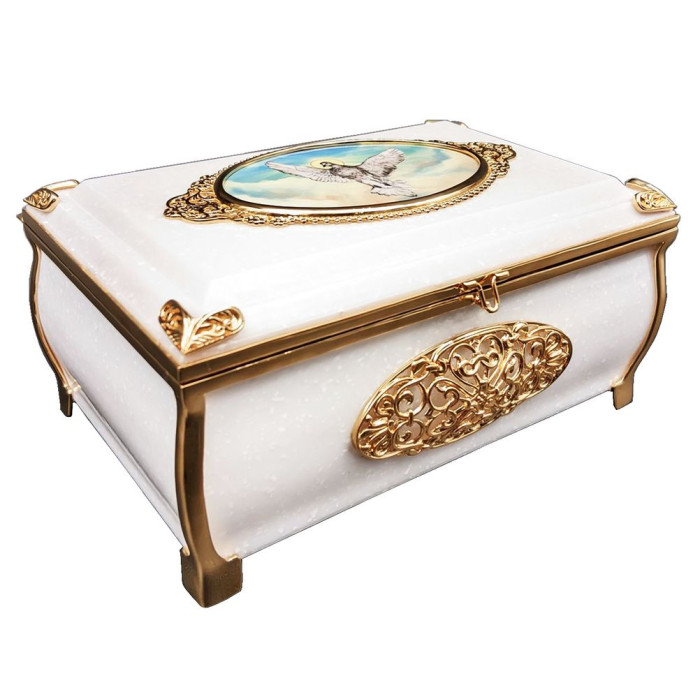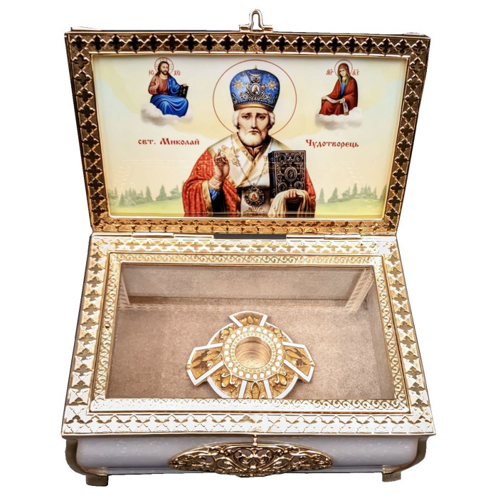 Ковчег з акрилу для частинок святих мощей в позолоченому латунном обрамленні з мощовиком.