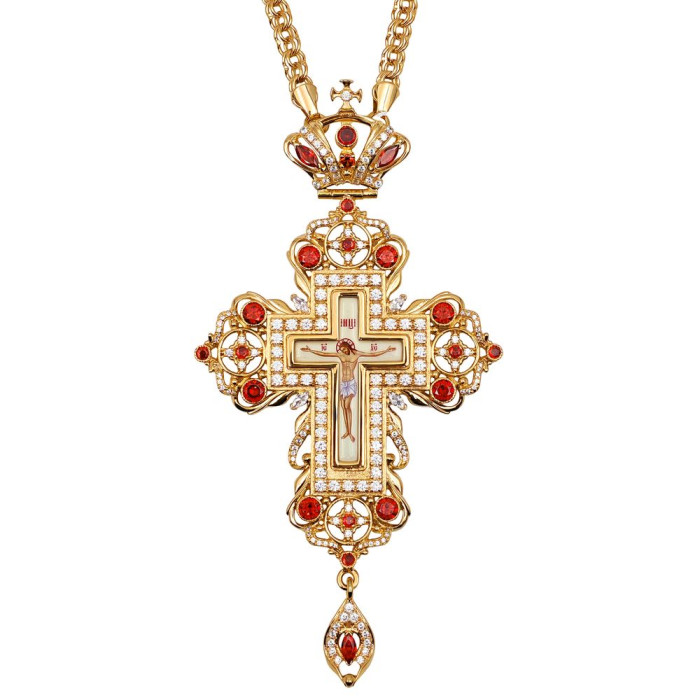 Хрест для священика наперсний з латуні в позолоті, з принтом, з вставками фіанітів, в комплекті з позолоченим ланцюгом.
