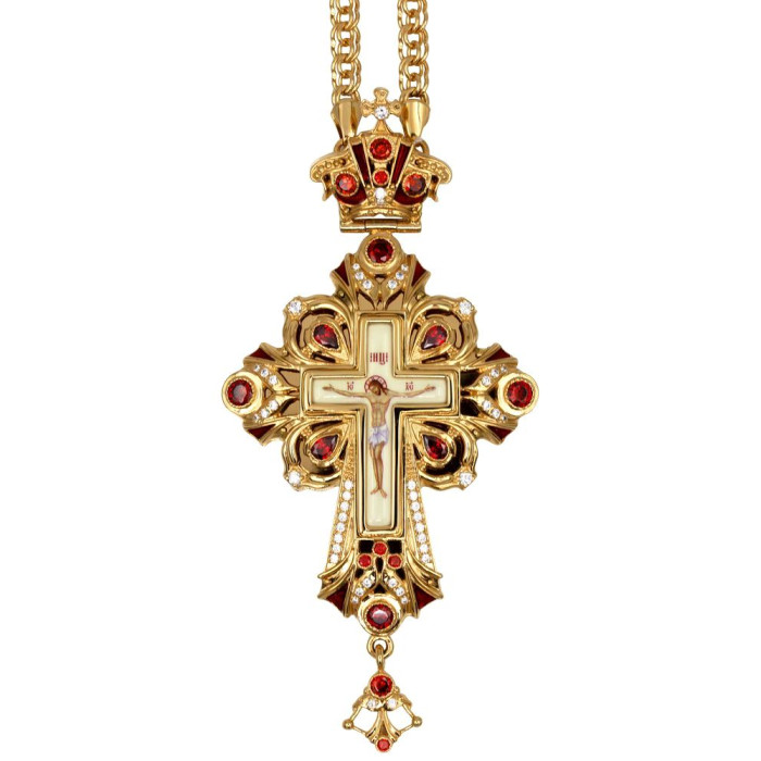 Хрест для священика з латуні в позолоті, прикрашений фіанітами і ювелірною емаллю, укомплеуктований ланцюгом.