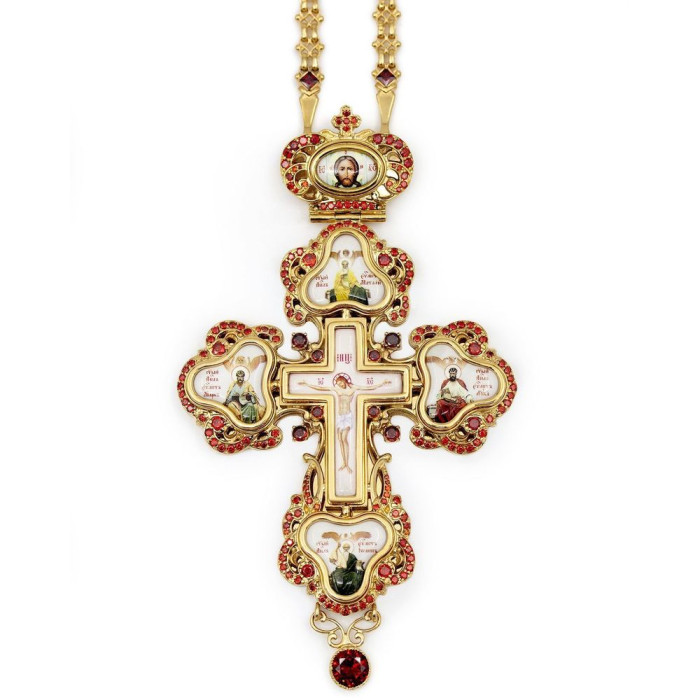 Хрест наперсний для священика з латуні в позолоті з латунними принтами і ланцюгом, прикрашений вставками фіанітів.