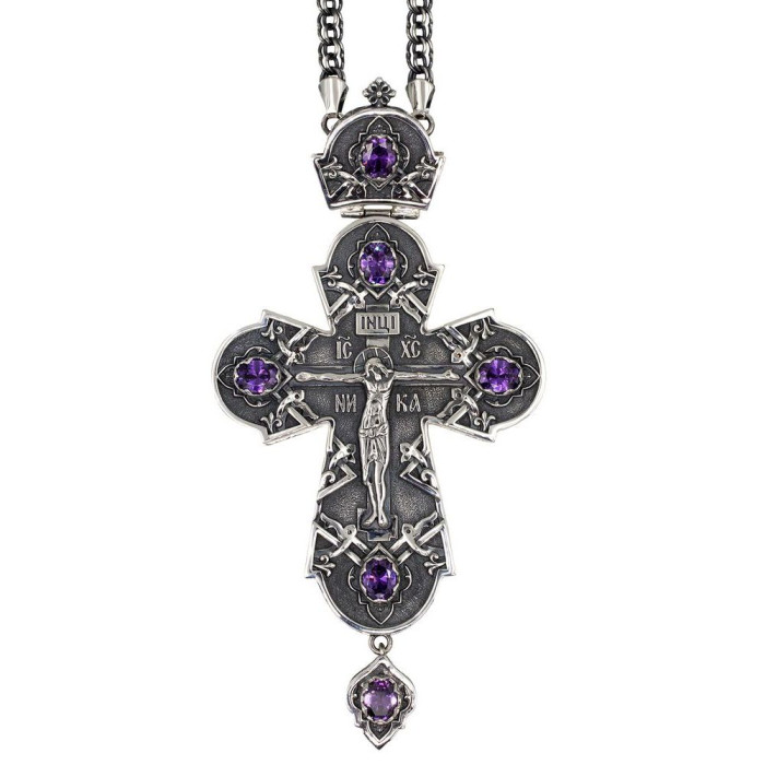 Хрест для священнослужителя з латуні в посрібленні, прикрашений фіанітами і декоративним чорнінням, в комплекті з посрібленим ланцюгом.
