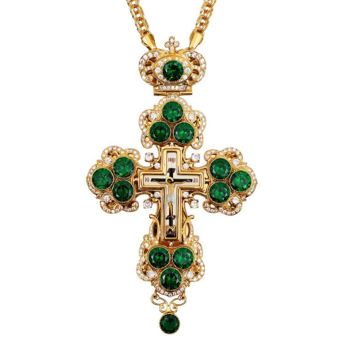 Хрест православний наперсний з ювелірного сплаву в позолоті з друкованим принтом, вставками фіанітів і ланцюгом