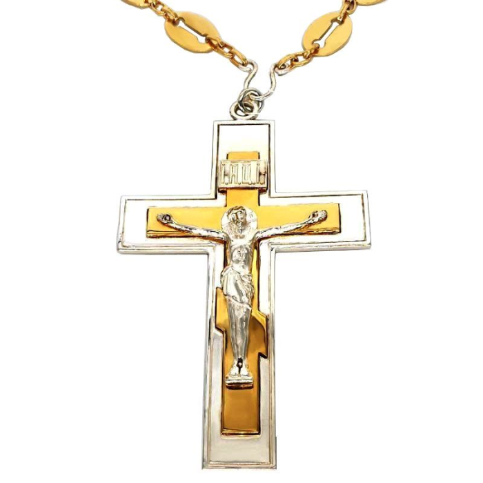 Хрест для священика з латуні в срібленні з фрагментарною позолотою, з литим розп'яттям і посрібленим ланцюгом.