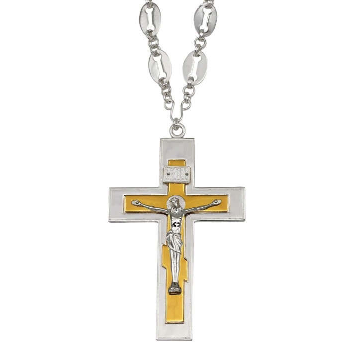 Хрест латунний з фрагментарною позолотою литним розп'яттям і з ланцюгом.