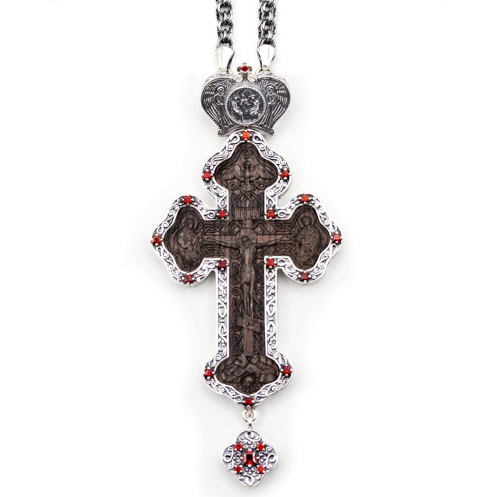 Хрест для священика з латуні в срібленні з образом із фарбованого ясеня, прикрашений вставками фіанітів і декоративним чорнінням, в комплекті з ланцюгом.