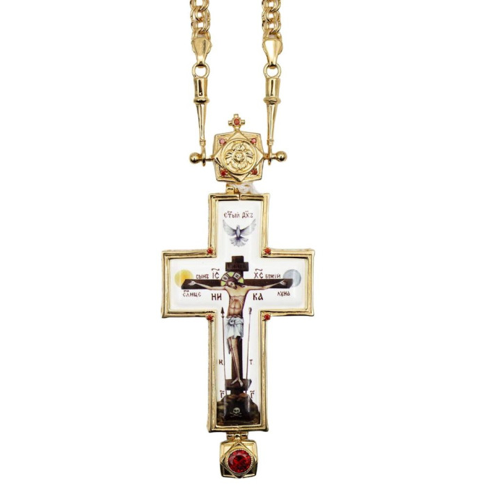 Хрест наперсний для священнослужителів з латуні в позолоті з фіанітами, в комплекті з позолоченим ланцюгом.