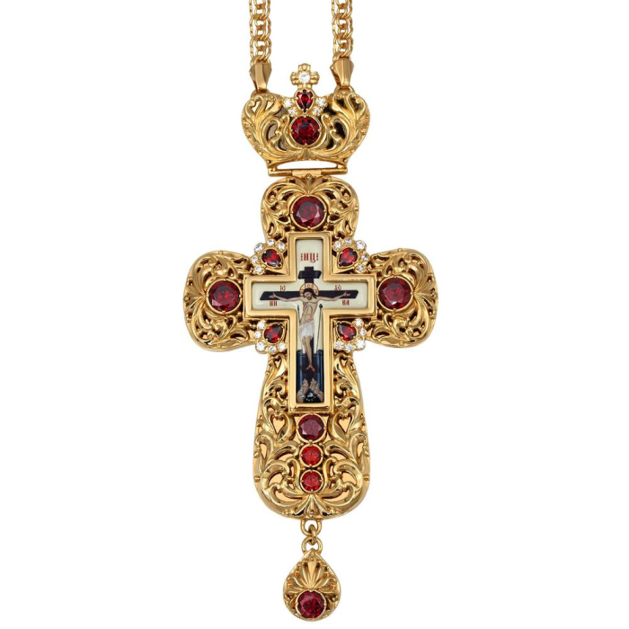 Хрест православний наперсний для священнослужителя з латуні в позолоті, прикрашений фіанітами, з друкованим Образом Розп'яття Господнього і ланцюгом
