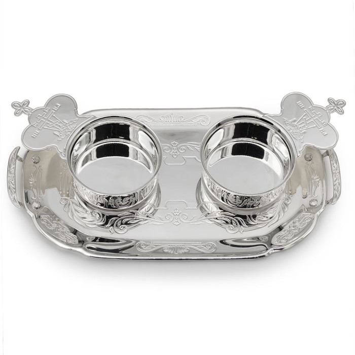 Набір для архієрейської запивки з латуні в посрібленні, у складі підноса і двох ковшів.