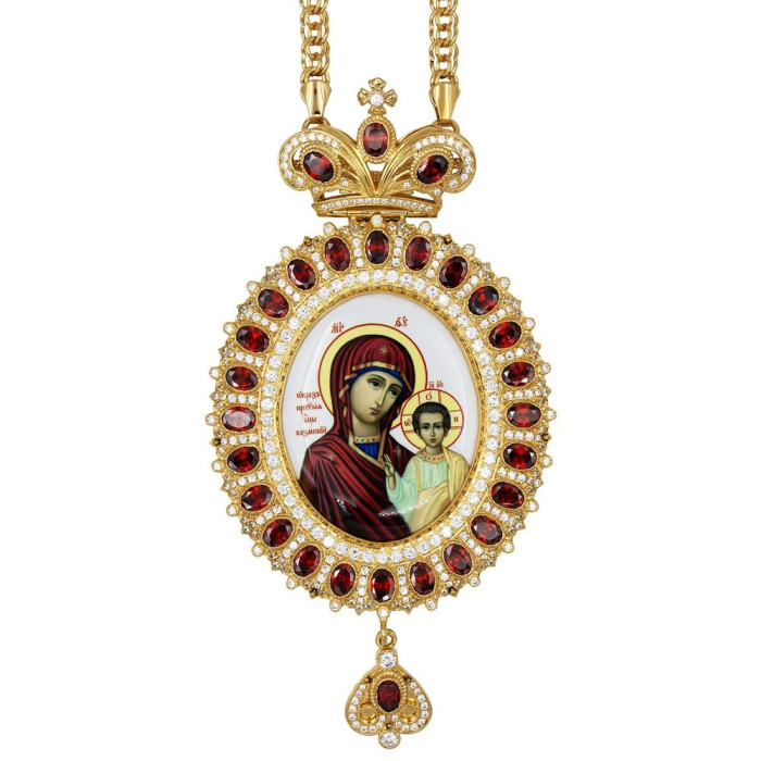 Панагія архієрейська наперсна з латуні в позолоті, прикрашена декоративним візерунком і вставками фіанітів різного розміру. Панагія поставляється в комплекті з позолоченим ланцюгом в презентабельній коробці з оксамитовим ложементом.