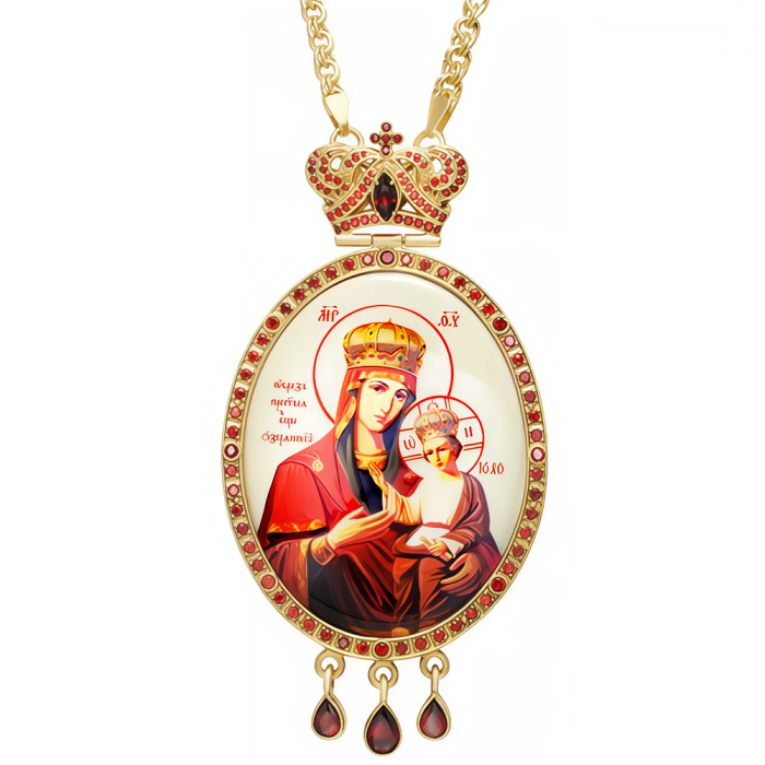 Панагія архієрейська наперсна латунна в позолоті з позолоченим ланцюгом, прикрашена вставками фіанітів.
