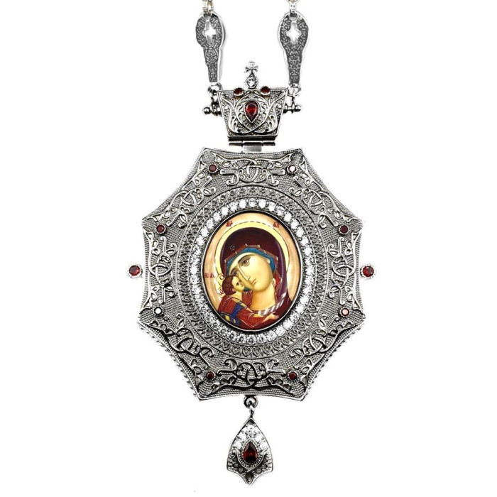 Панагія архієрейська з латуні в срібленні, оздоблена фіанітами та декоративним чорнінням, у комплекті з ланцюгом.