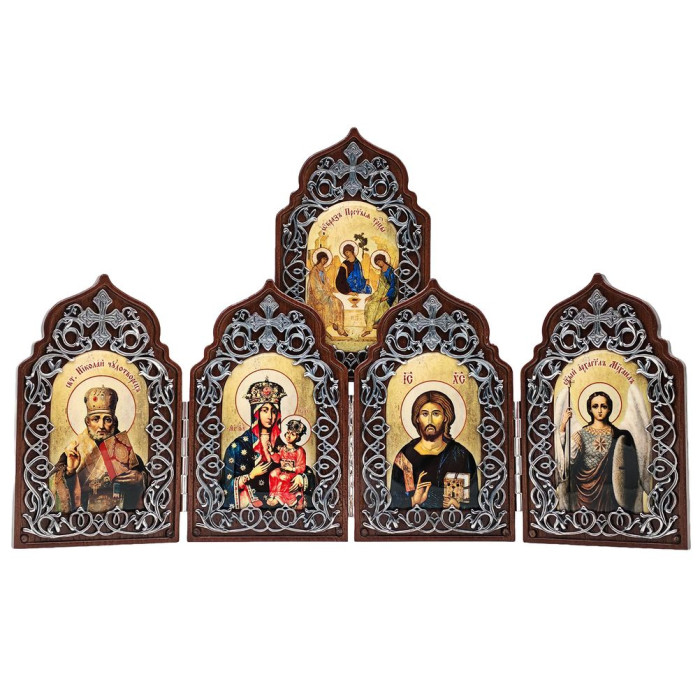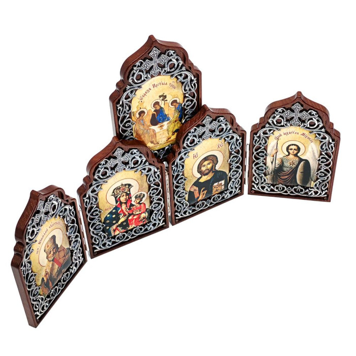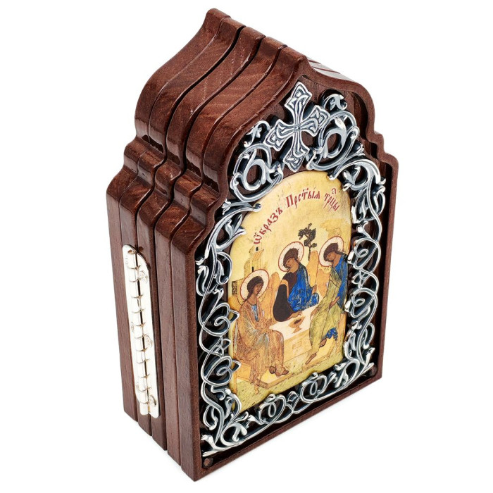 Складень на основі з дерева, прикрашений латунними вставками в срібленні з декоративним чорненням.