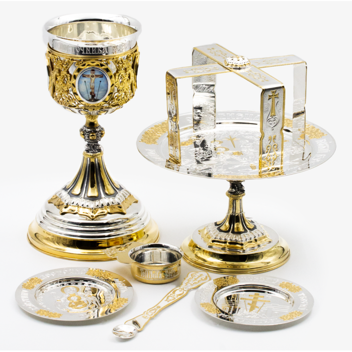 Євхаристійний набір комбінований з латуні в срібленні з фрагментарною позолотою, оздоблений декоративним чорнінням, з чашею на 1 літр.